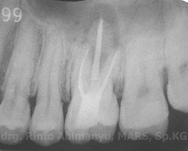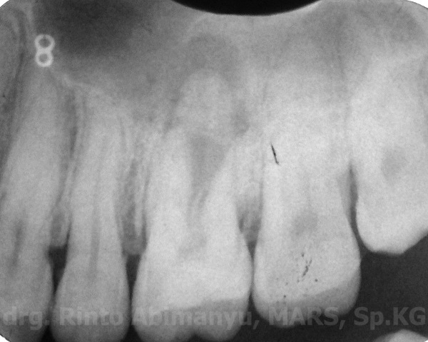 Dari foto ronsen terlihat tambalan yang hampir mengenai kamar pulpa dan lesi radiolusen yang luas pada akar palatal…. Dari hasil pemeriksaan klinis dan radiografis sudah bisa dipastikan bahwa gigi ini nekrosis, dan perjalanan infeksinya sudah sampai membentuk abses…