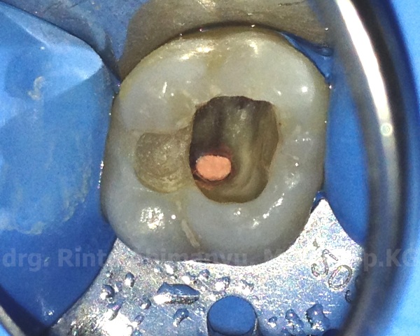 Kamar pulpa dibersihkan dari sisa2 siler kemudian dilakukan etsa serta bonding setelah itu lapisan dasar menggunakan SDR (Dentsply) sampai kurang lebih 4 mm dari permukaan oklusal… Untuk bagian oklusal saya restorasi menggunakan komposit Z 350 XT (3M) single shade A2 body…