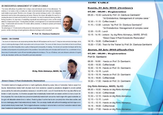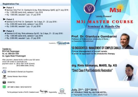 Nah selama bulan puasa ini juga memang semua kegiatan seminar di stop dulu, jadi nanti setelah lebaran baru dimulai lagi beberapa kegiatan seminar… Salah satunya nanti pada tanggal 21 dan 22 Juli 2016 saya diundang oleh M3i mengisi seminar tentang “Direct Class II Post Endodontic Restoration” bareng pembicara dari luar negeri Prof. Gambarini di Hotel Double Tree Jakarta, buat yang berminat ikutan langsung kontak nomer yang ada di flyer ini ya…