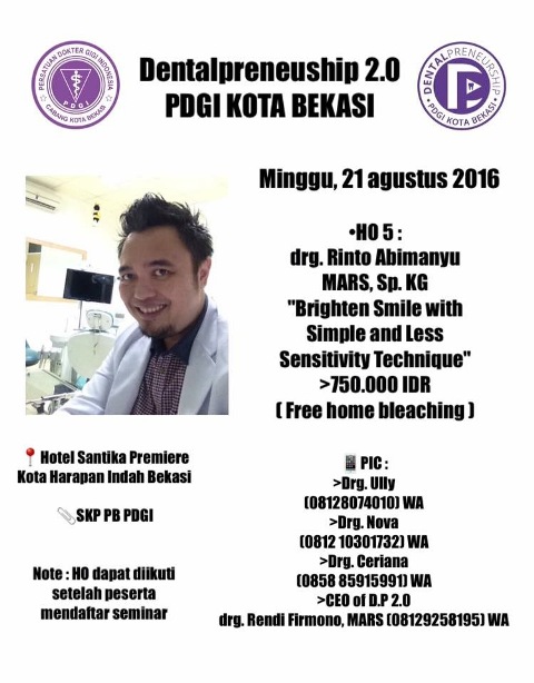 Nah jadwal sharing saya berikutnya tanggal 21 Agustus 2016 di acara Dentalpreneurship 2.0 PDGI Kota Bekasi… yuuk buat teman2 yang berminat silahkan daftar ke contact person berikut