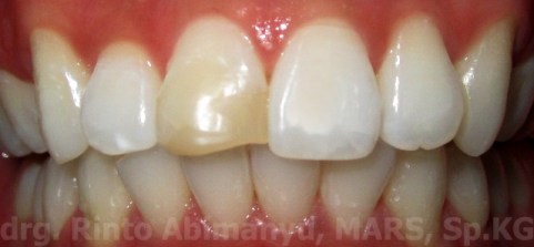 Pasien datang dengan keluhan gigi depan atasnya pernah patah dan sudah ditambal, tetapi bentuk dari tambalannya tidak sesuai dengan anatomi gigi normal sehingga pasien merasa kurang nyaman bila bertemu dengan orang lain… Ditambah warna tambalan tersebut mulai berubah..