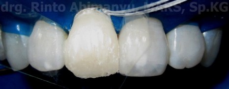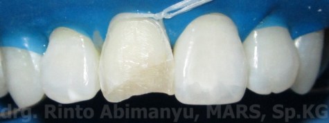 Setelah preparasi terlihat adaptasi tambalan yang lama masih cukup baik sehingga saya tetap pada rencana untuk tidak membongkarnya… Kemudian dilanjutkan dengan proses etsa dan bonding…