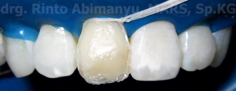 Saya jelaskan kepada pasien kondisi yang terjadi pada giginya dan menginstruksikan agar tidak lagi memakai obat pemutih gigi yang dia pakai… Kemudian saya jelaskan juga mengenai kesulitan pemilihan warna untuk menambal giginya, karena persediaan warna saya yang paling putih masih kurang putih bila dibandingkan keadaan gigi sekitarnya..