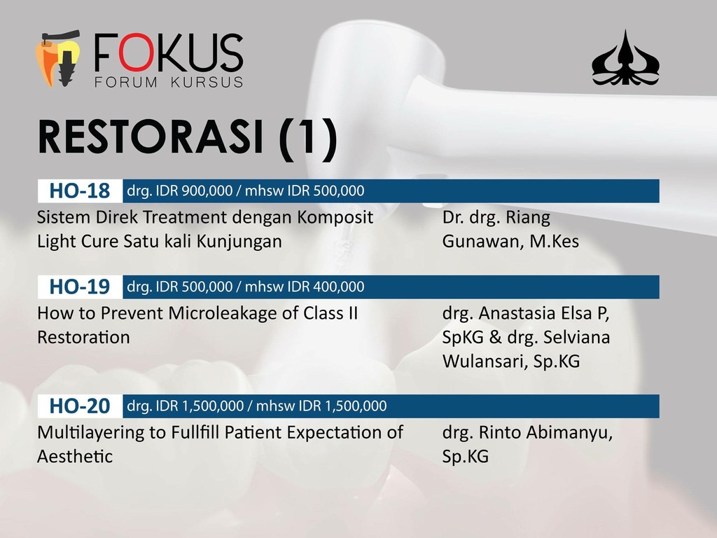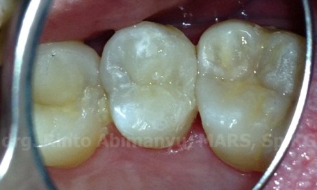 Basis menggunakan low shrinkage stress komposit atau istilah lainnya bulk fill menggunakan Fitek Bulk Fill (3M) kemudian untuk lapisan permukaannya menggunakan Z 350 XT (3M)… Setelah itu pengecekan oklusi dilakukan, kelebihan restorasi diambil menggunakan bur diamond fine, dilanjutkan pemolesan menggunakan brush disertai pasta alumunium oxide…