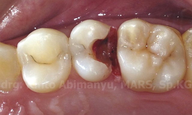 Terlihat karies sudah mengenai pulpa sesuai dengan foto ronsen dan gingiva sebelah distal terlihat sedikit menutupi tepi gigi, maka saya lakukan pemotongan gingiva dengan cauter untuk mempermudah dalam pembuatan dinding distal (artificial wall)