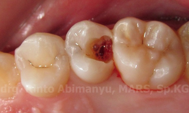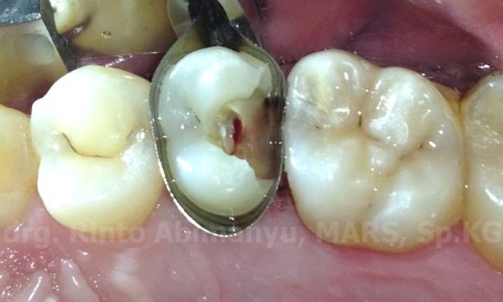 Dari ronsen terlihat memang kavitas meluas sampai di bawah permukaan oklusal dan mengenai pulpa, tidak terlihat kelainan di periapeks.