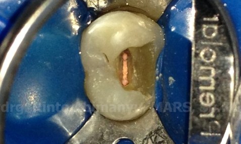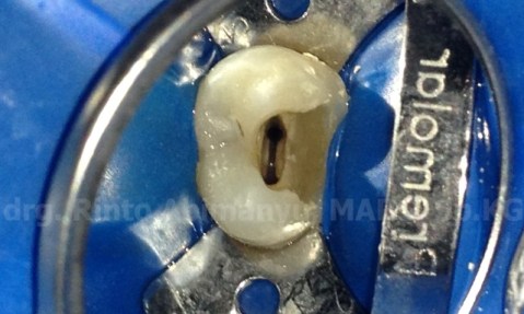 Setelah artificial wall selesai, rubber dam dipasang dan siap untuk perawatan saluran akar.. Kavitas dipenuhi dengan NaOCl 5,25% lalu penjajakan dimulai dengan K-File no.8, no.10 setelah itu dengan Pro Glider (Dentsply).. Ditemukan dua saluran yaitu bukal dan palatal, pengukuran panjang kerja memakai apex locator Root ZX mini (Morita)….