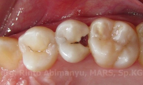 Setelah melakukan anamnesa yang diperlukan saya lakukan pemeriksaan klinis, terlihat gigi 15 karies di bagian distal dan memang kavitasnya agak besar di bagian dalam sehingga kalau kemasukan makanan akan sulit keluar..