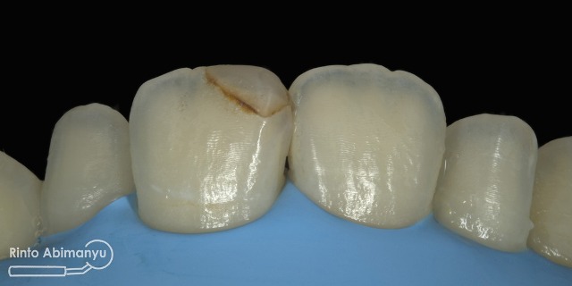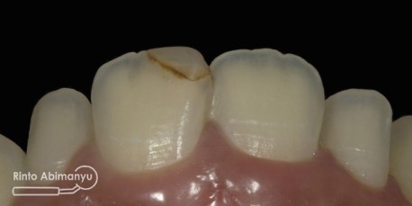 Gigi pasien ini pernah fraktur di ujung insisal waktu masih sekolah SD dan sudah ditambal oleh ibunya, nah sekarang sudah mau masuk kuliah, dan di gigi tersebut terlihat garis kecoklatan yang menandakan ada karies sekunder…