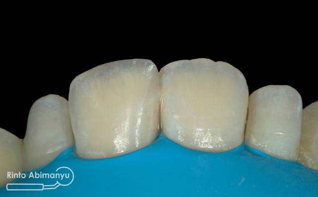 Palatal shell saya buat dengan tehnik free hand menggunakan komposit shade translusen Β  Β  Z350XT (3M)… Tehnik free hand disini maksudnya adalah seluloid strip itu saya tempelkan ke bagian palatal gigi 21 dengan hanya ditahan menggunakan jari tangan…