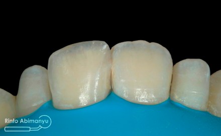 Saya lakukan pencocokan warna gigi dengan tehnik menempelkan bulatan kecil komposit pada bagian 1/3 tengah kemudian disinar, lakukan dengan beberapa shade warna sampai mendapatkan warna yang mendekati bagian tersebut….