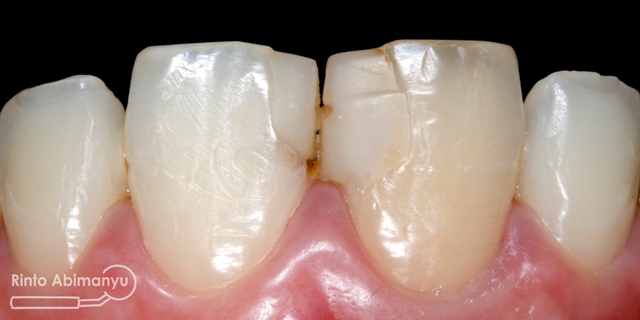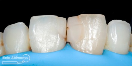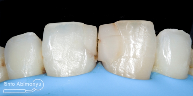 Terlihat kondisi gigi 11 dan 21 yang ada tambalannya di mesial, ada karies sekunder dan bentuk tambalan tidak mengikuti anatomi gigi 11 dan 21 seharusnya…