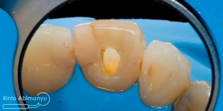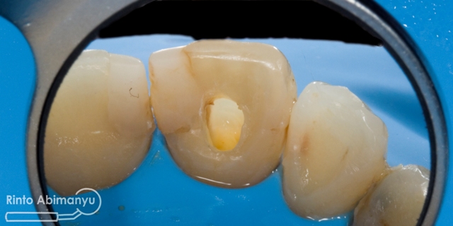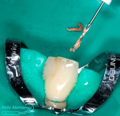 Untuk kunjugan pertama ini target saya adalah mengeluarkan bahan pengisi dari perawatan sebelumnya. Gigi saya isolasi dengan rubber dam kemudian dibuat akses dari palatal sampai menemui guttap yang ada di saluran akar.