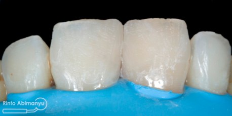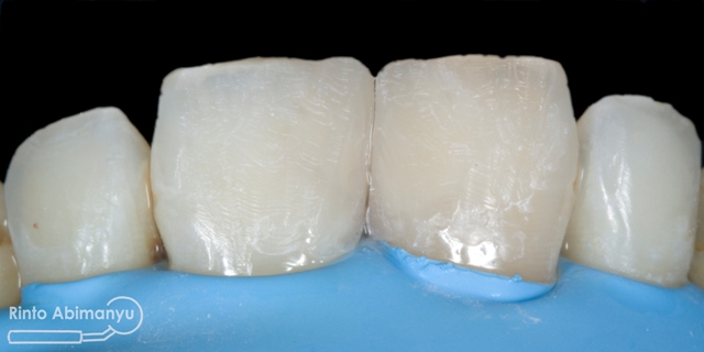 Gigi-gigi kemudian dietsa dan dibonding, penambalan menggunakan resin komposit Palfique LX5 (Tokuyama) shade OPA2, OA3, A3… Pada kasus ini saya tidak memakai cetakan silikon untuk membantu membentuk outline gigi, hanya mengandalkan seluloid strip..