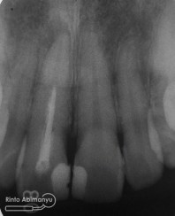 Ternyata dari foto ronsen diketahui gigi 11 pernah dilakukan perawatan saluran akar tetapi pengisiannya tidak sepanjang kerja..