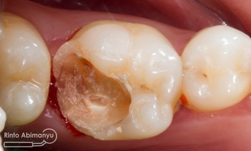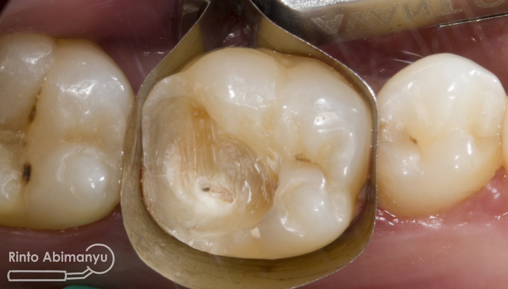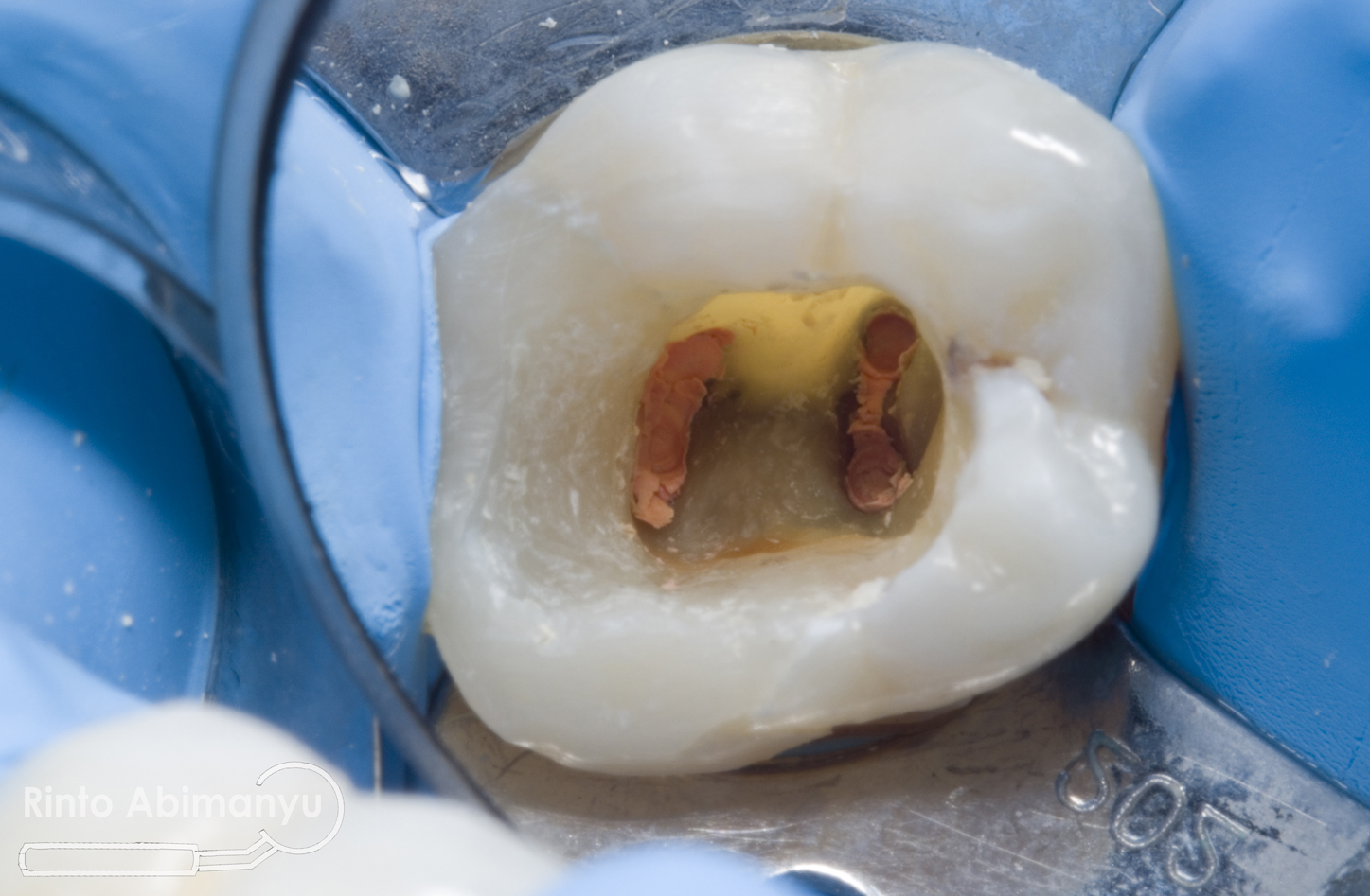 Terlihat kavitas sudah mengenai kamar pulpa, dan dari hasil tes respon dingin serta tes perkusi menunjukkan hasil negatif… Kondisi yang saya temukan diinfokan ke pasien dan dijelaskan rencana perawatan untuk giginya, setelah pasien mengerti dan menyatakan setuju perawatan baru dimulai…