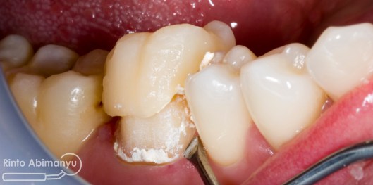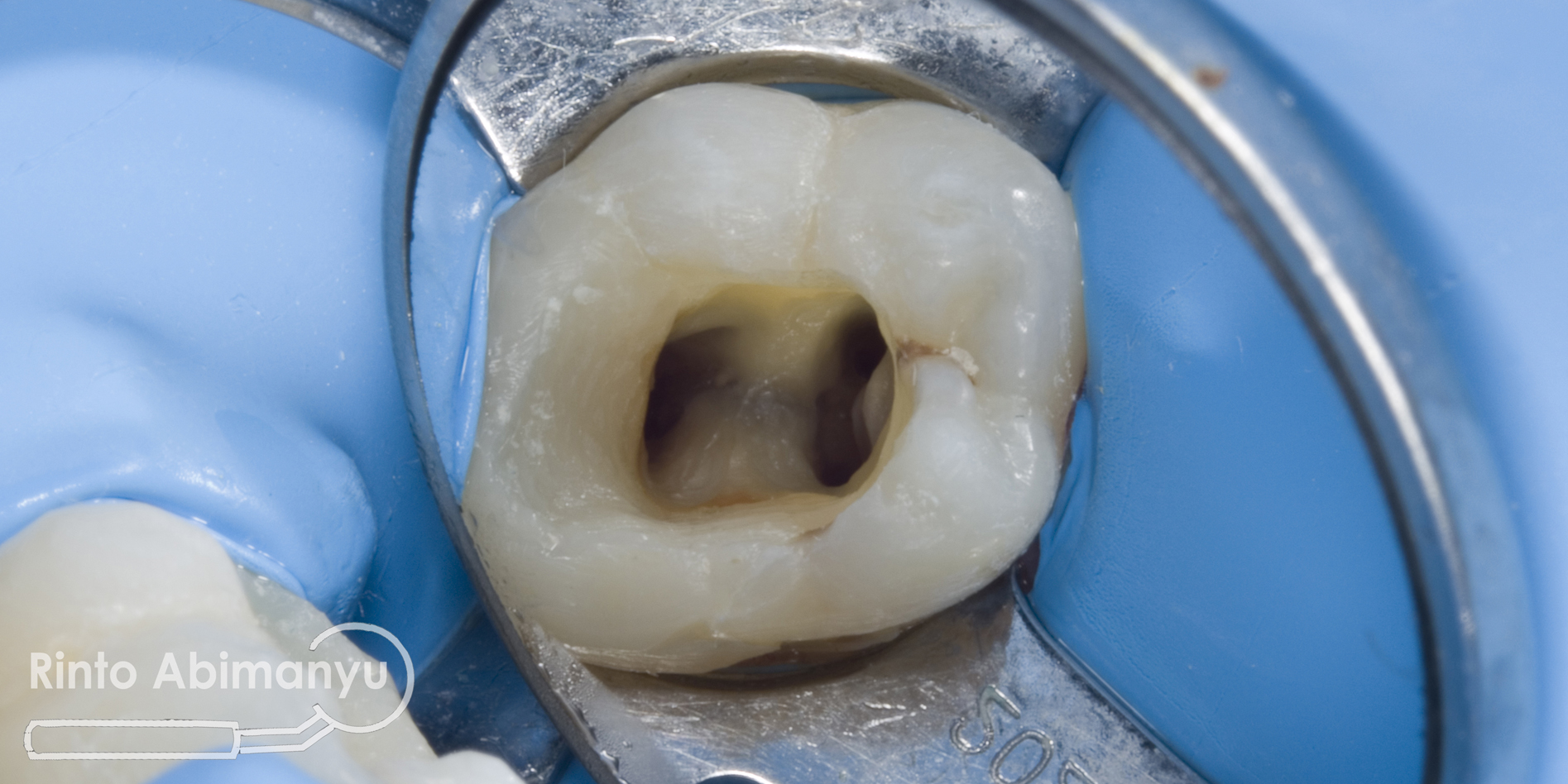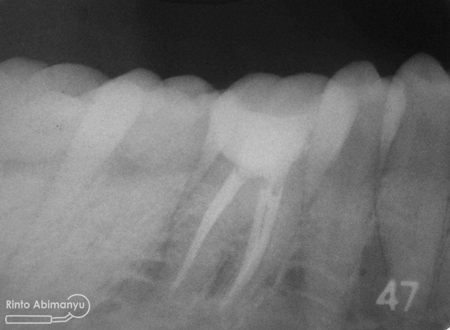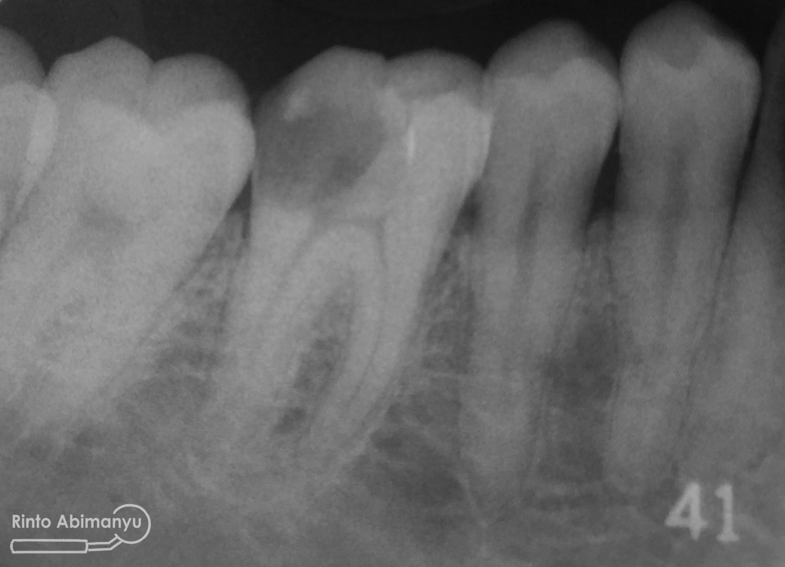 Terlihat kavitas sudah mengenai kamar pulpa, dan dari hasil tes respon dingin serta tes perkusi menunjukkan hasil negatif… Kondisi yang saya temukan diinfokan ke pasien dan dijelaskan rencana perawatan untuk giginya, setelah pasien mengerti dan menyatakan setuju perawatan baru dimulai…