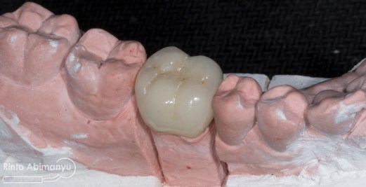 Dilakukan percobaan crown, dicek retensi dan resistensi, integritas tepi, titik kontak, oklusi dan warna… setelah semua tidak ada kendala maka siap dilakukan penyemenan… Semen yang dipakai adalah GIC Fuji I (GC)..