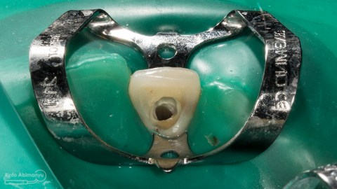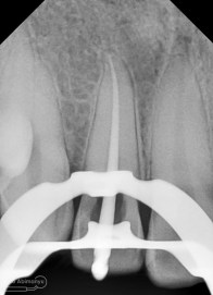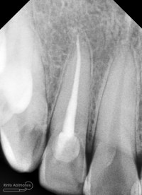 Setelah pengisian selesai seluruh kavitas dibersihkan dari sisa2 siler, sehingga bahan restorasi yang kita pakai untuk menutup kavitas dapat beradhesi dengan baik. Untuk basis kavitas saya menggunakan komposit X-tra Base (Voco), bahan ini dapat beradaptasi dengan baik pada dinding kavitas. Setelah itu dilanjutkan penambalan menggunakan Amaris (Voco).
